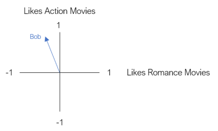 Bob이라는 유저가 있다고 생각해보면, 이 사람은 액션 영화를 좋아하지만 로맨스 영화는 그닥 좋아하지 않는다라는 임베딩을 얻었다고 가정하면 그의 선호도는 위 사진과 같이 표현할 수 있습니다.