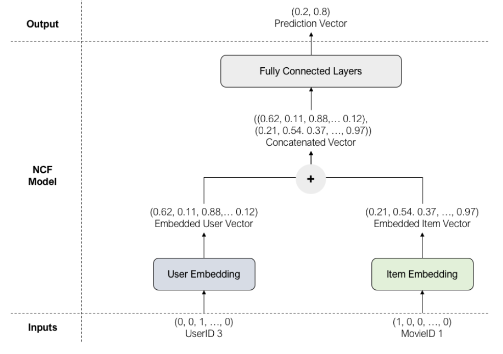 - 유저 임베딩, 아이템 임베딩을 concat하여 이를 FC 레이어를 거칩니다.