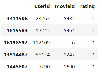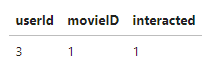 이런식으로 데이터가 존재한다면 interaction이 존재한다고 할 수 있는 것이며, 따라서 rating 컬럼을 1로 바꾸면 됩니다.