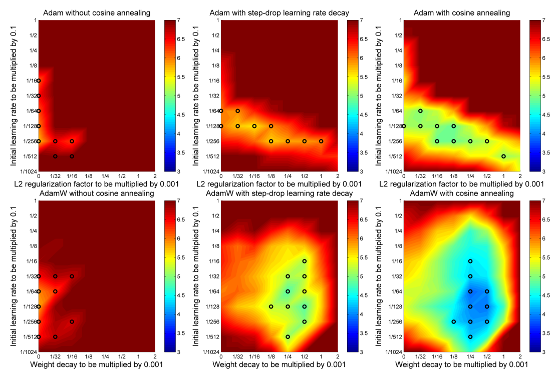 이렇게 디커플링된 weight decay를 적용한 AdamW (아래 행)이 일반 L2가 적용된 Adam(위 행)보다 더 좋은 일반화 능력을 보이고 있다. 즉.. 디커플링함으로써 각자 할 일에 방해를 하지 않게 하니까 더 좋은 성능을 보이더라라고 말할 수 있을 것 같다.